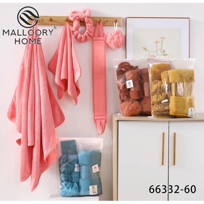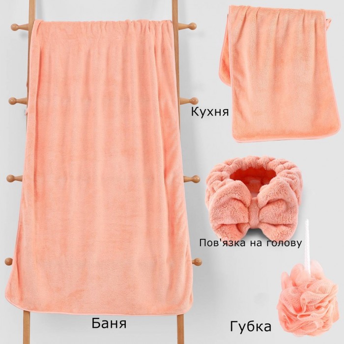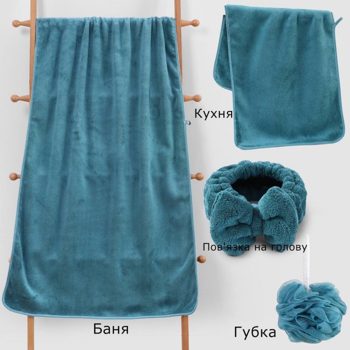 В комплекті: Рушник для обличчя 50*90 см, Рушник для лазні 70*140 см, Мочалка 2шт, Пов'язка на голову 1шт.